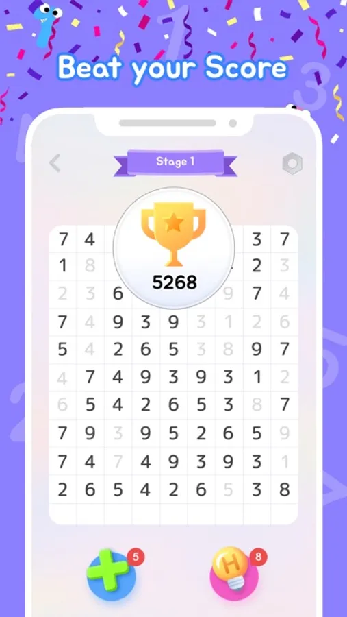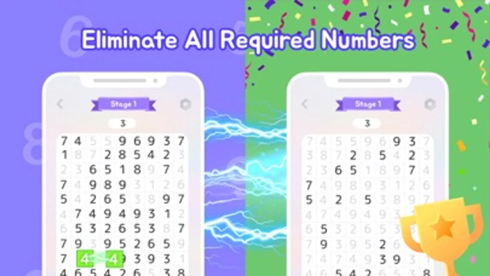 • Removing all the numbers from the number grid, you are the champion of number match games.