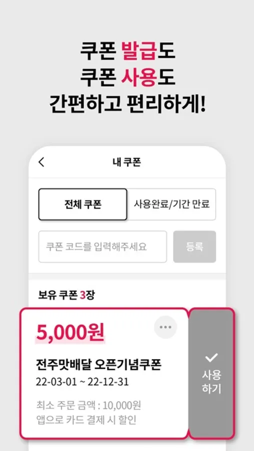 - 배달, 포장, 매장(픽업) 원하는 주문 방법으로 전주의 맛집들을 만나볼 수 있습니다.
