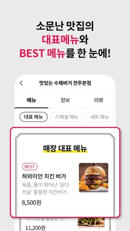 - 전주의 소문난 맛집들의 대표메뉴와 BEST 메뉴를 한눈에 쉽게 주문 할 수 있습니다.
