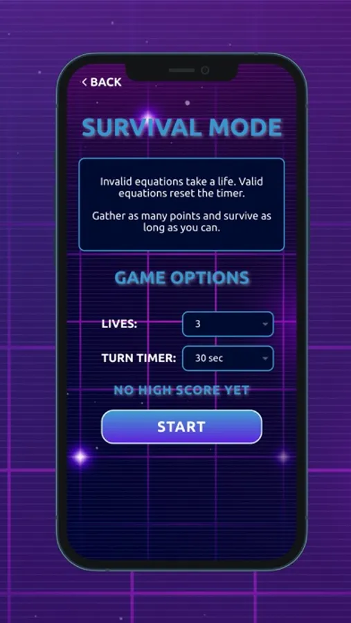 Invalid equations take a life. Valid equations reset the timer. Gather as many points and survive as long as you can.