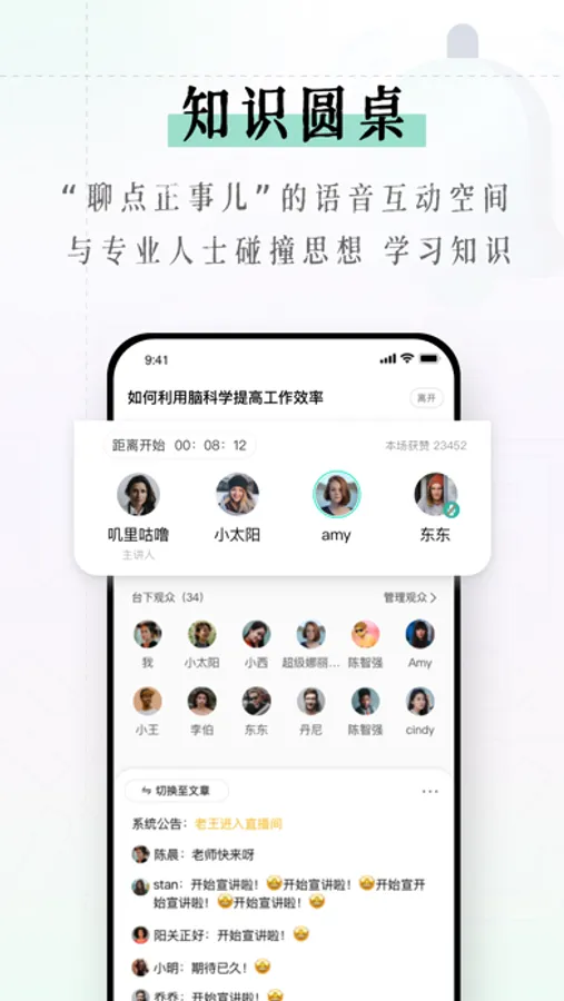 也可以在语音直播间与大咖进行圆桌讨论,进行思想碰撞;