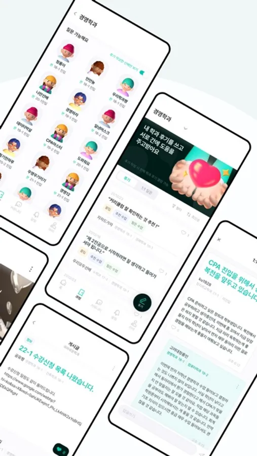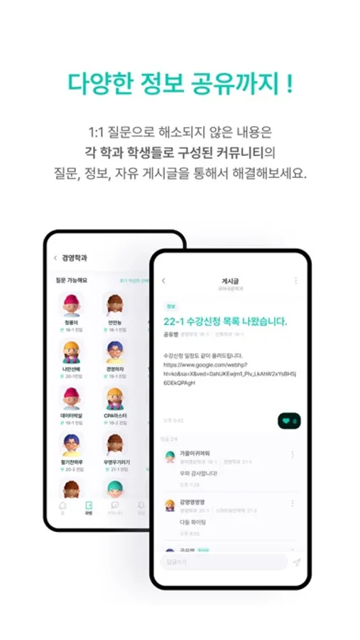 1:1 질문으로 해소되지 않은 내용은 각 학과 학생들로 구성된 커뮤니티의 질문, 정보, 자유 게시글을 통해서 해결해보세요.