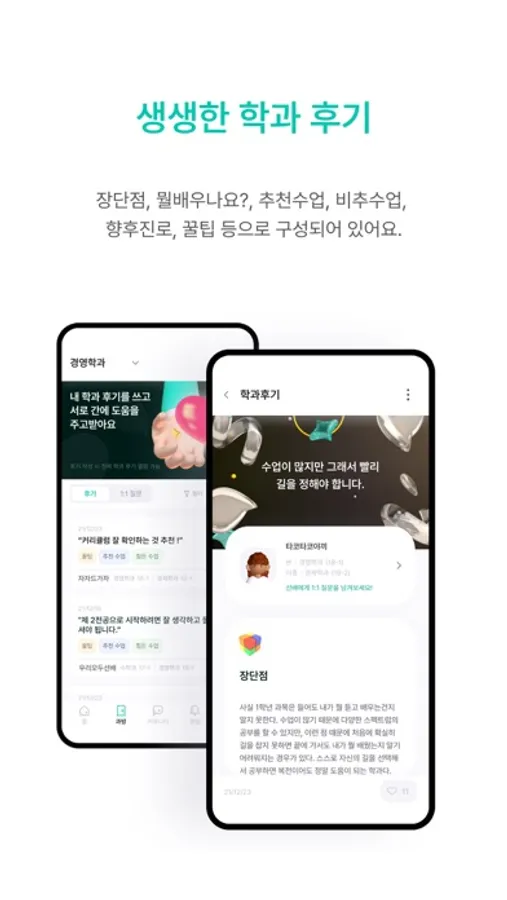 한줄평, 장단점, 뭘배우나요?, 추천수업, 비추수업, 향후진로, 꿀팁 등으로 구성된 실제 학과 구성원의 후기를 확인하세요.