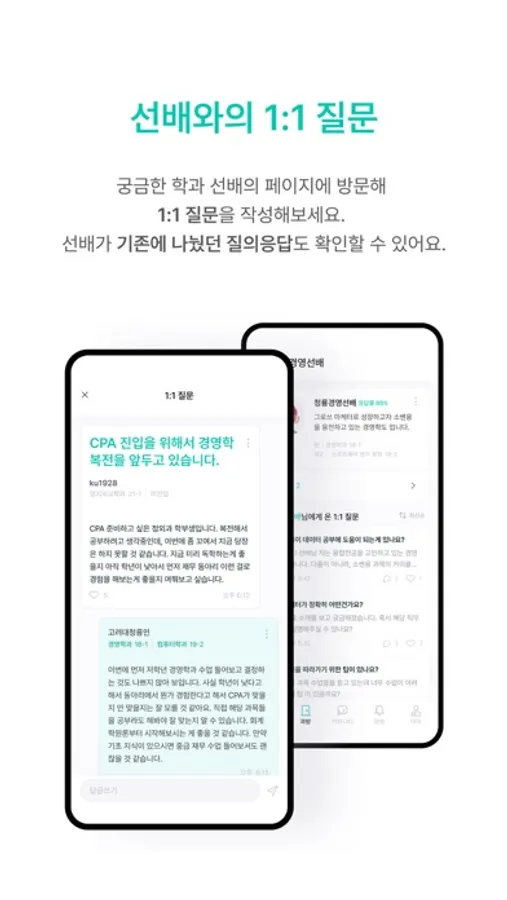 궁금한 학과 선배의 페이지에 방문해 1:1 질문을 작성해보세요. 선배가 기존에 나눴던 질의응답도 확인할 수 있어요.
