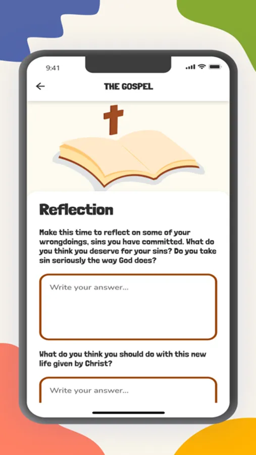 It has a simple interface where you answer questions on different topics by using the Bible as a reference for the answers as well as taking time to reflect on those topics.