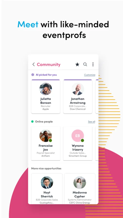 - Based on your interests and profile, you’ll get AI-powered personalized recommendations to match you up with other eventprofs and thought leaders. Make professional connections you’ll keep forever!