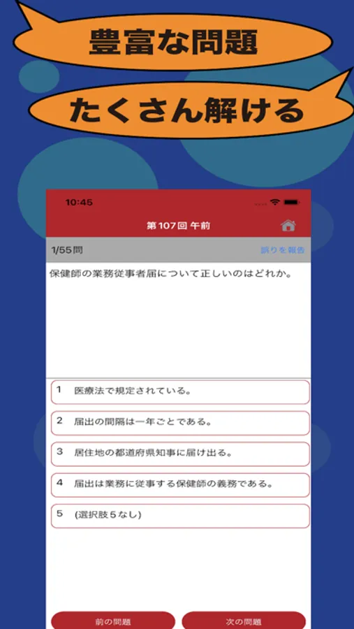 サクサク動きます!また復習機能があるので、効率的に勉強できます。 たくさんの問題が解けます。上部と下部のそれぞれのエリアでスクロール可能なので、問題と選択肢を同時に見ることができます。間違えた場合は記録として残り、問題文の上部に表示されます。さらに間違えた問題だけをまとめて解ける機能を搭載。復習時はランダムでも解けます。ホームに戻ったとしてもつづきから問題を進められます。解いたあとにバッチリと要復習が下部に表示され、こちらは手動で変更可能なため、たまたま正解したものを要復習に切り替えることができます。反対に、正解したけれど不安な問題は要復習にすることで、あとからの解き直しに便利になります。図は拡大できます。問題を解かなくても次の問題にどんどん進めるため、戻って解き直すことが可能です。問題に誤植ありましたら、報告できる機能あり。問題について出典厚生労働省より、アプリ内部最適な機能を搭載している。本アプリを使用し、有効活用できると思います、みなさまの温かいレビューをお待ちしております。