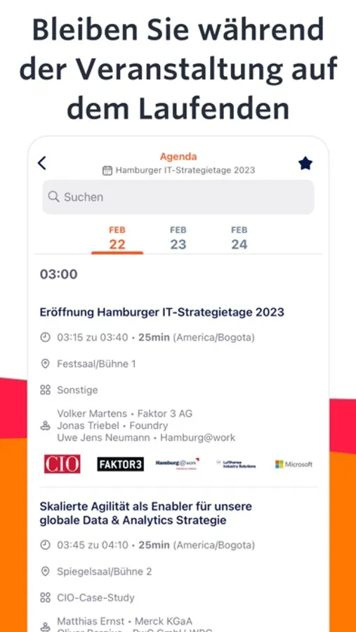 Laden Sie die mobile App herunter, um Live- und On-Demand-Inhalte zu erkunden, spannende CIO-Keynotes zu hören, sich mit anderen Teilnehmern zu vernetzen und Auftritte und Veranstaltungen zu verfolgen, egal wo Sie sind. Erstellen oder vervollständigen Sie Ihr Profil, um andere Teilnehmer mit den gleichen Interessen zu entdecken.