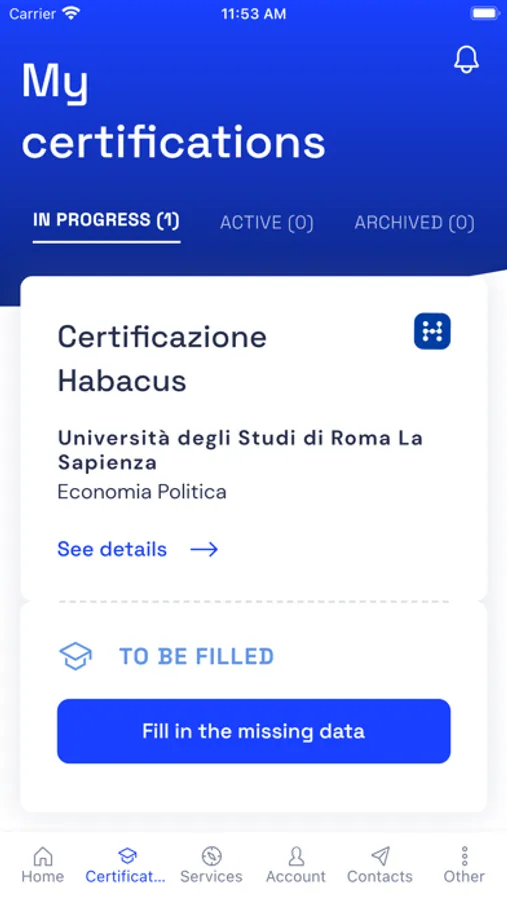 To start the Habacus certification request, you must enter your personal data, information on the course of study you are attending or intend to attend, and upload the documents required. You will complete the procedure by sharing your identity document and affixing an advanced electronic signature.
