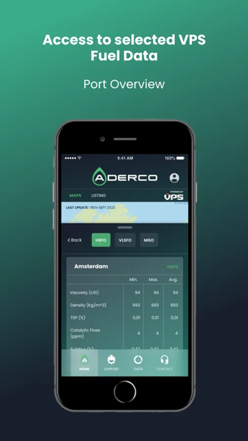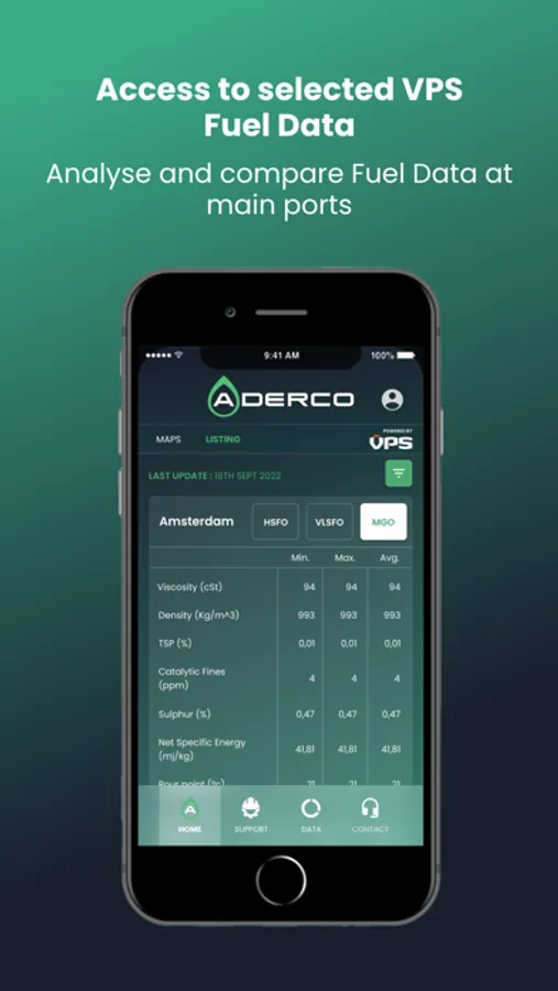 The App also features fuel oil specification data for main ports, powered by Veritas Petroleum Services (VPS).