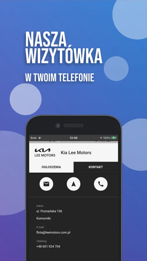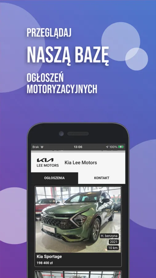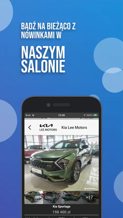 KIA LEE MOTORS to rodzinna firma z tradycjami. Oferujemy szeroką gamę pojazdów nowych jak i używanych. Ponieważ chcemy być z naszymi klientami blisko i zależy nam, abyście Państwo byli na bieżąco z naszymi pojazdami, oddajemy w Państwa ręce naszą aplikację mobilną dzięki której: