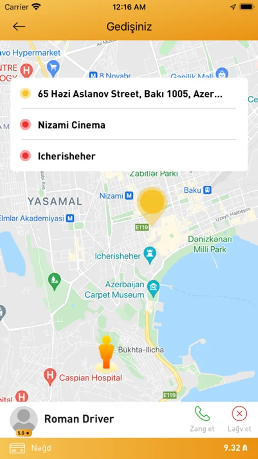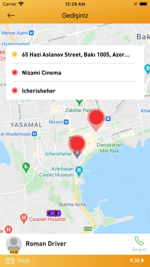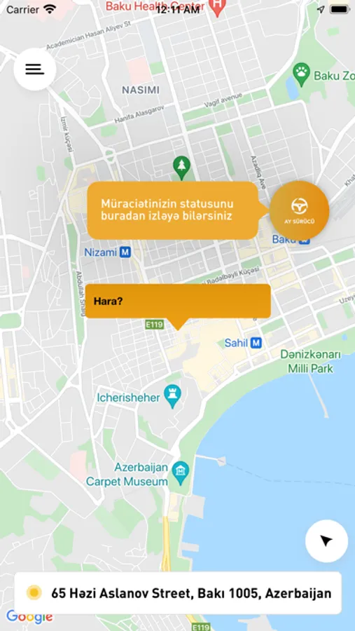 Onlayn olaraq mobil tətbiq vasitəsilə olduğunuz ünvandan gedəcəyiniz ünvanı qeyd edərək sürücü sifariş edə bilərsiniz.