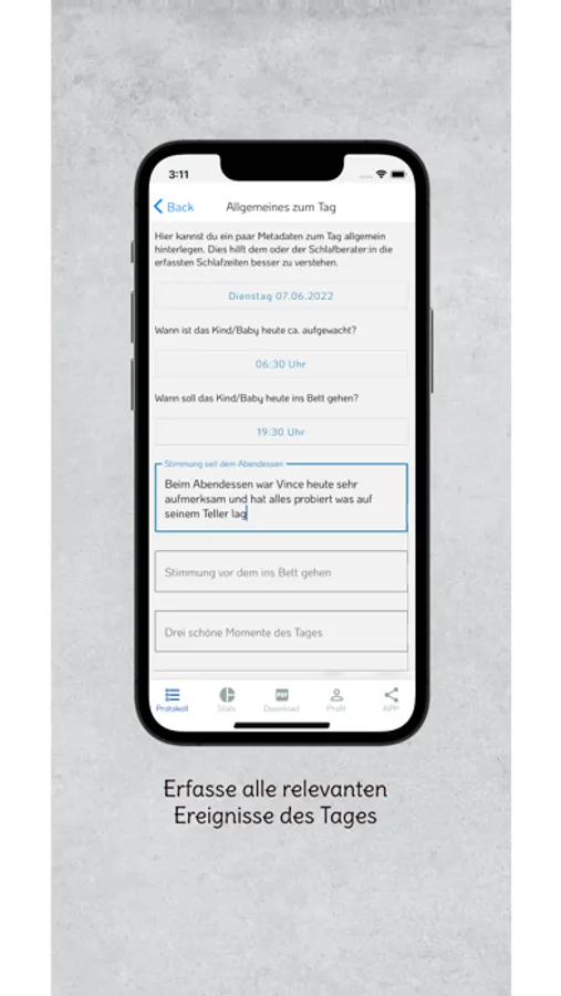 - Protokollierung von Schlaf, Essen, besonderen Ereignissen am Tag, der Gefühlslage und allen anderen wichtigen Informationen