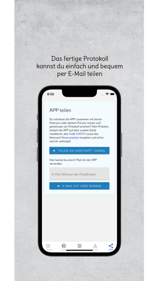 - Durch einen persönlichen Code kannst du das Protokoll zusammen mit deinem Partner an zwei Geräten bearbeiten