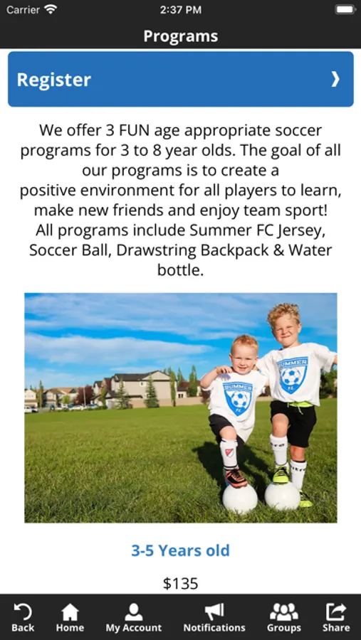The Summer FC app allows you to manage your account with ease, register for classes, parties, and special events. You'll also receive important notifications about class changes, closings, registration openings, special announcements, and upcoming events.