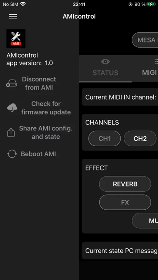 - configuring parameters of AMI interface ( PC and CC messages, midi channel )