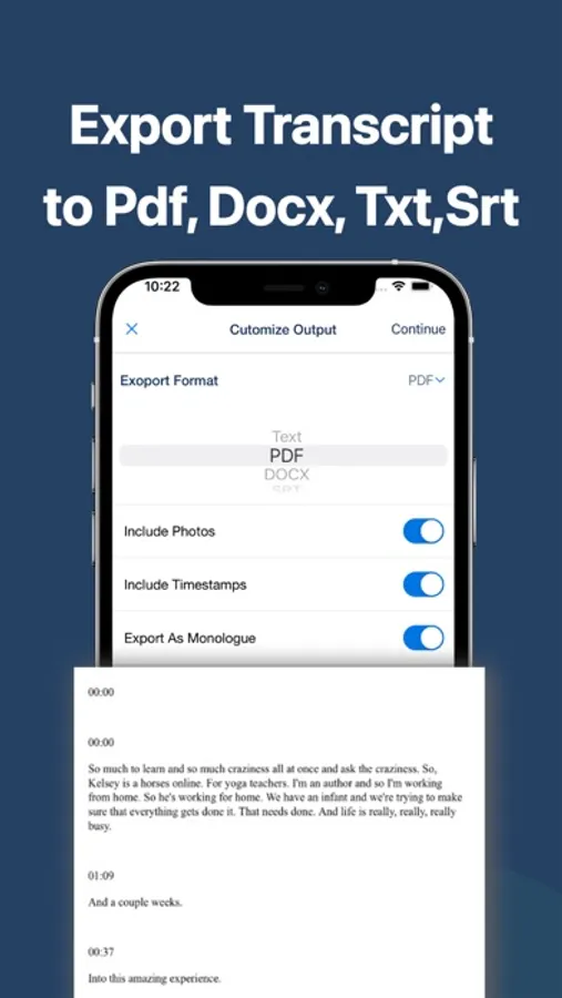 ● Export text of your transcriptions as .pdf, .txt, .docx, or .srt.