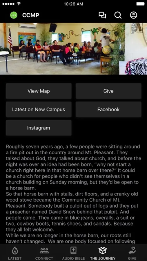 The Community Church of Mt. Pleasant(CCMP) is a body of believers under the direction of Jesus Christ. We are rooted in the original church that Jesus lived and died to establish as revealed in Acts 2:42-47. We are a hospital for the broken, a foundation for those that need a fresh start, and a family that loves to worship Jesus Christ. Our heart's desire is to see the world, beginning with this community, transformed by Jesus Christ through the equipping of intentional disciple-makers and reaching diverse communities with the Gospel. We believe that no matter where you are at in your relationship with Jesus, we want to equip and empower you to take your next step in that relationship. You can experience freedom. You can experience purpose. You can experience peace. You can experience joy. You can experience love. Let us help you experience Jesus, and the rest will flow from that.