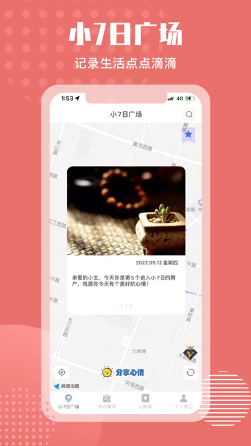 【心情广场】记录分享自己每天的心情,可公开展示在地图上,也可以设置仅自己可见,永久会员可以绘制属于自己独一无二的心情表情,记录分享你的生活点滴吧。