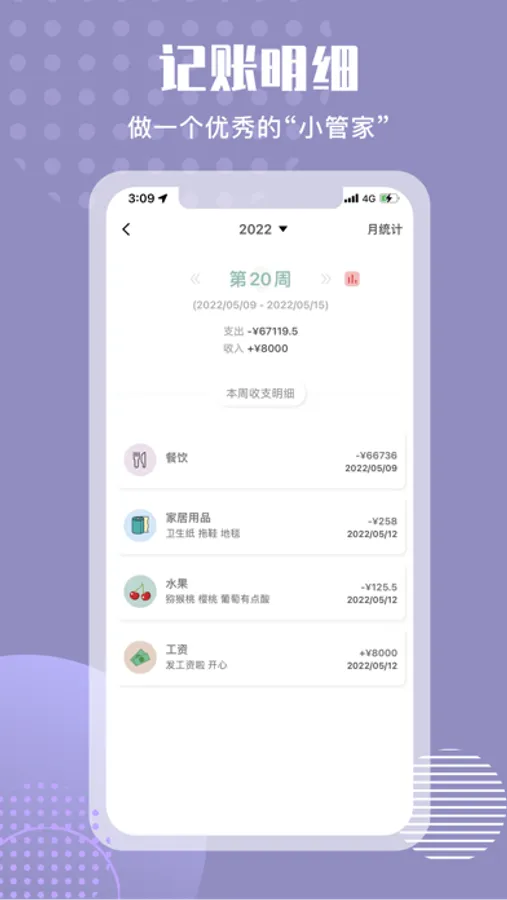 【记账本】记录你的每周开支明细,每一笔账单清晰明了,永久会员可查看账单统计图表,无限次添加自定义开支分类。