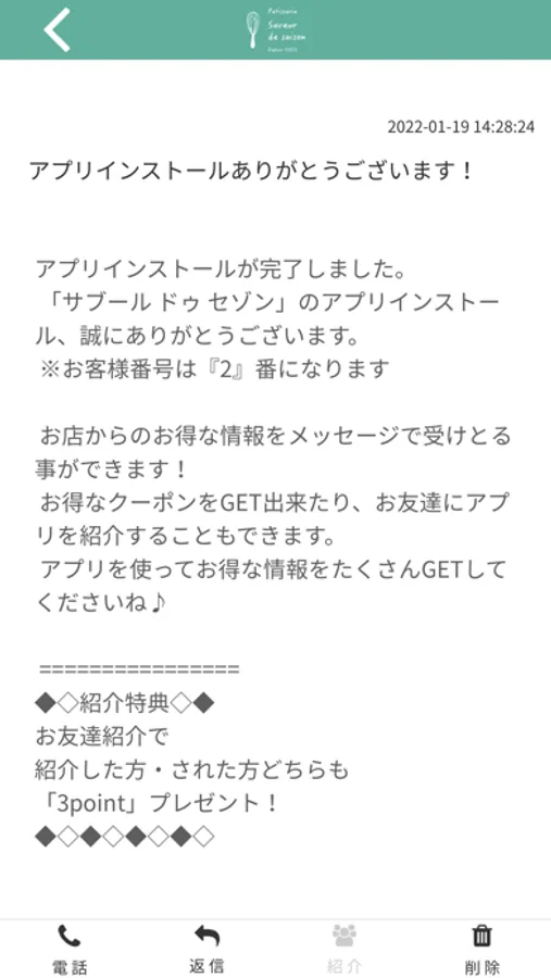 サブールドゥセゾンのアプリをSNSを通じてお友達に紹介する事ができます。