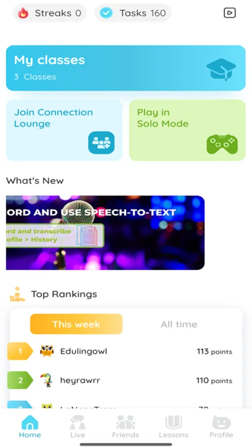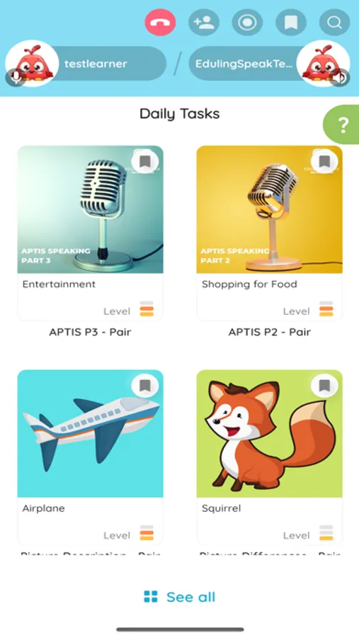 Being first of its kind and endorsed by leading experts in the field of task-based language teaching, Eduling Speak connects English learners to complete a task or game together by speaking in English. You can simply turn on the app, choose a task or game, and wait to be connected with another learner from anywhere in the world. It's convenient, effective, and fun. With 5-10 minutes of talking a day, improvements are guaranteed.