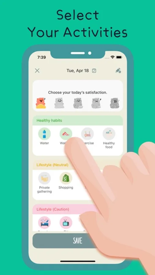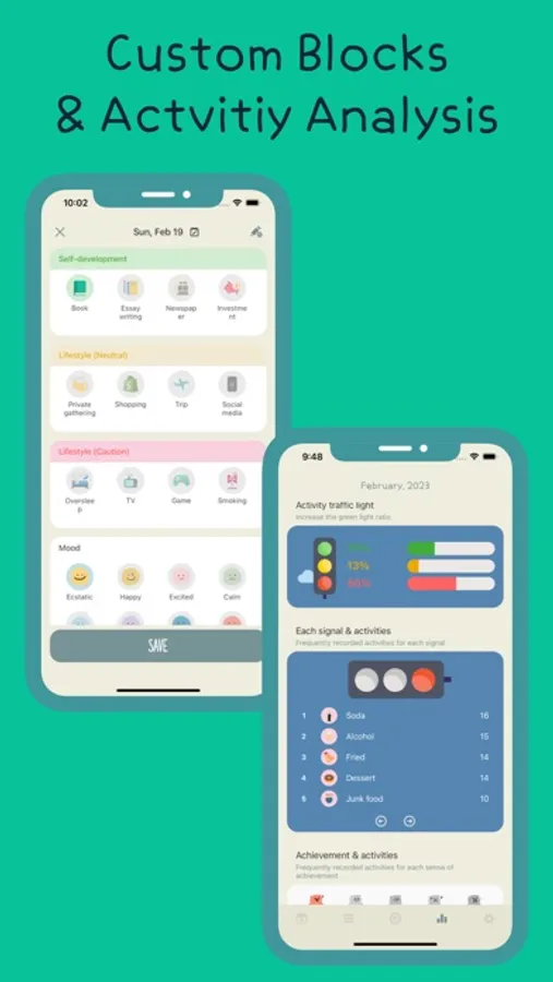 Personalize all your activities in 4 colored blocks. For example, from meeting friends to habits you want to improve. Then tap on today's activity to complete the diary.