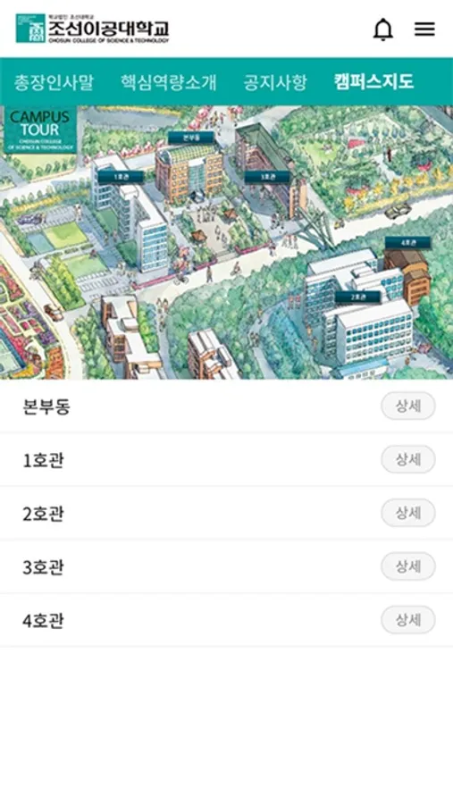 - 총장인사말,핵심역량소개,공지사항,캠퍼스지도 제공