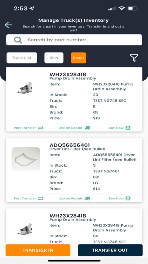 Transfer a part from one truck to another - Easily select another truck, part and bin to transfer too