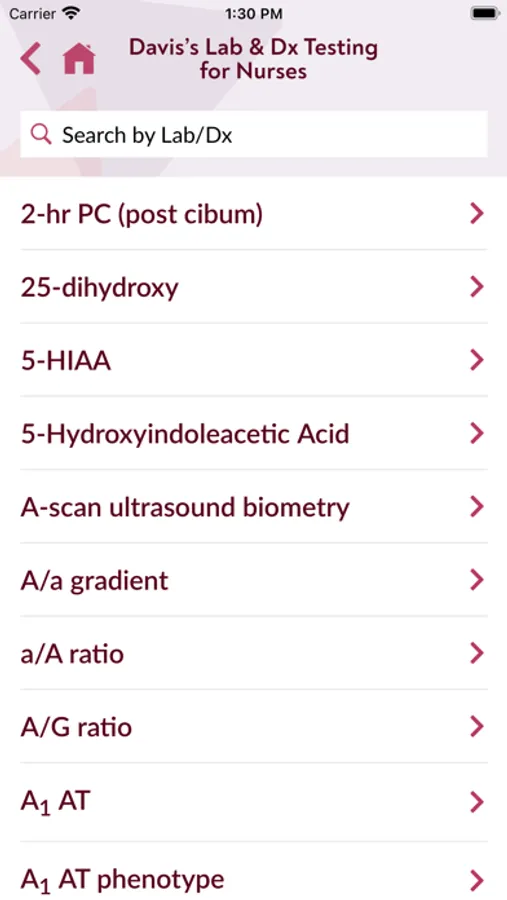 Tests and procedures are listed in alphabetical order by their complete name for quick reference. The search feature allows fast searches by abbreviation, synonym, disease/disorder, specimen type, or test classification.