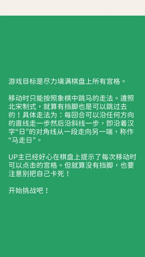 But you have to move with following the rule of Horse in Chinese Chess. According to the rule applied in Northern Song Dynasty, the Horse could jump over even if there is a foot block. Specific movement rule : each round the Horse can move two steps along a straight line in any direction and then move one step along the vertical line. e.g. Jump like on the Sun in Chinese language, so called "Horse Jump the Sun".