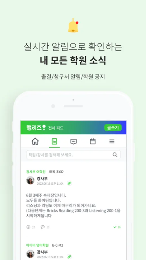 모든 학원 소식이 실시간 알림으로 발송됩니다