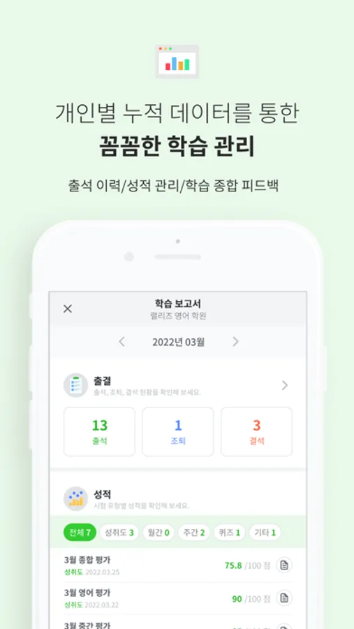 학생별 출석 이력/성적 현황/학습 종합 피드백 제공!