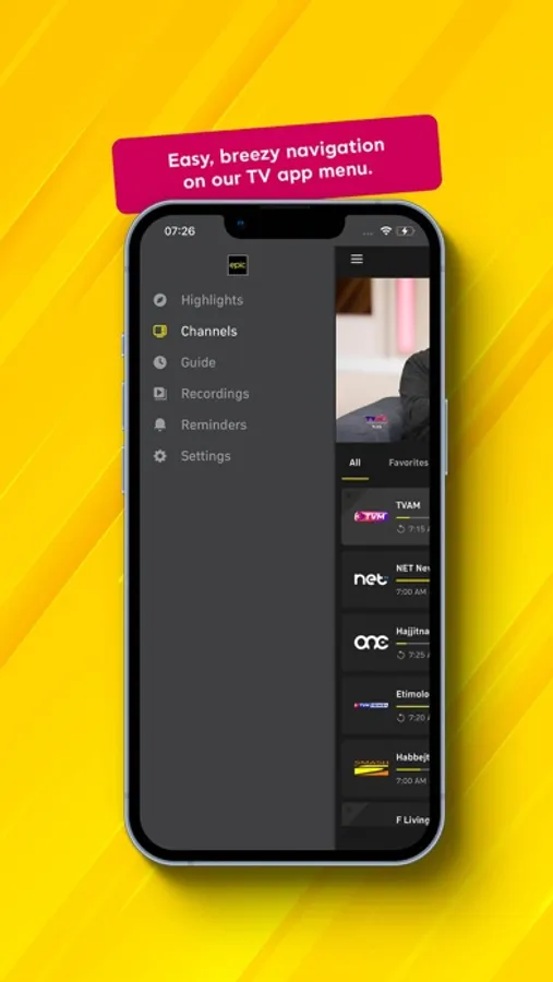 TV by epic app instantly allows you to enjoy your favourite channels. It is provided free of charge to all Epic TV subscribers. As an Epic TV customer, you can watch different programmes on up to five devices with up to two concurrent streams at the same time. On the app you can access the electronic programme guide. The app also lets you pause and resume live TV channels, record your favourite show and view existing recordings, set reminders of your favourite shows and replay past TV programmes from the last seven days. Anything you can do from your TV remote, you can do it with the TV by epic app."
