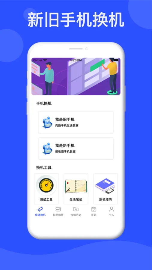 这是一款用于新旧手机数据传输的应用助手,当你在更换手机的时候可以使用它来将旧手机的所有文件传输到新手机,再也不用担心旧数据丢失,可以进行图片、视频、通讯录、日历资料互传,快捷分享自己的文件。也可以扫描和创建二维码的应用,可以用它来生成网址、文本、名片、电话号码、电子邮件地址等二维码并分享给好友。