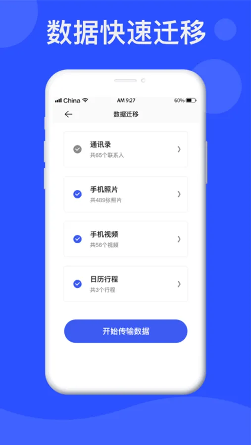 当你需要更换新手机的时候可以将旧手机的照片、视频、联系人、行程等通过本应用传输到新手机。实现数据的快速传输。
