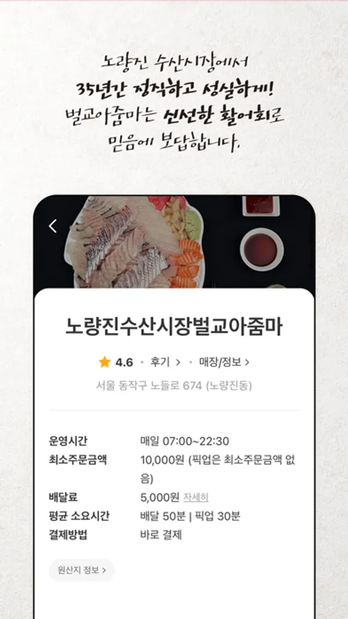 노량진수산시장에서 35년동안 정직하고 성실하게 영업하고 있어요.