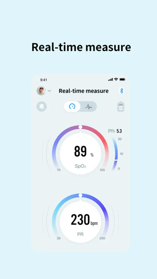 1. Real-time measurement: SPO2, PR and PI display in two real-time data style: dashboard and waveform. The real-time display is abundant and the data result is clear, making the test more simple and interesting.