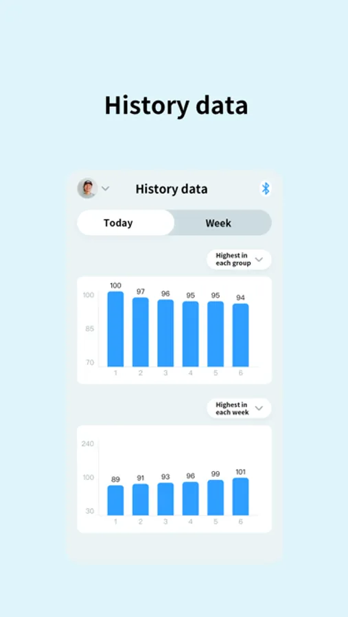 3. Historical data: Users’ measurement data will be stored locally on mobile phone. In historical data module, users can review the data of SPO2 and PR for the day and week clearly to observe the dynamic trend.
