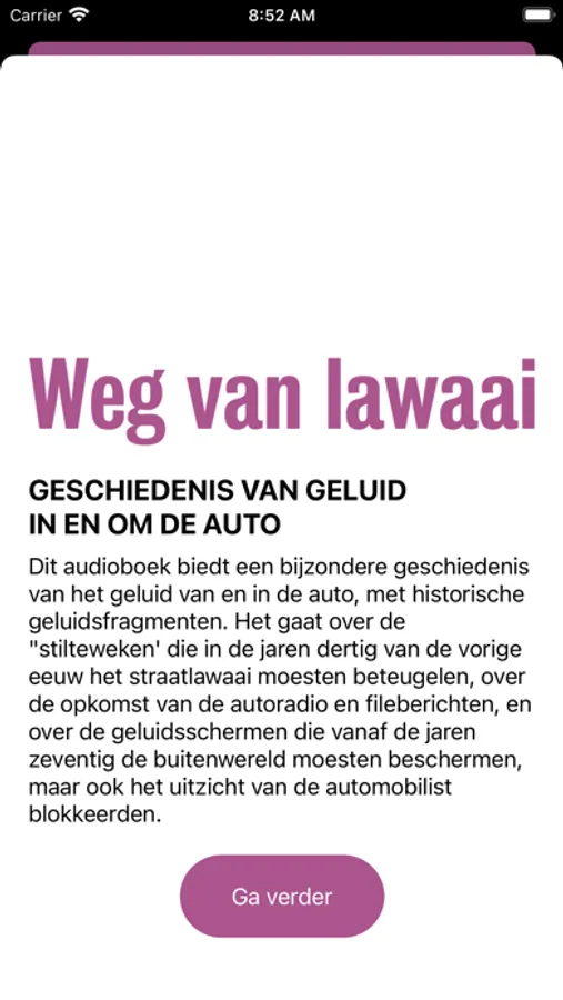 Dit audioboek biedt een bijzondere geschiedenis van het geluid van en in de auto, met historische geluidsfragmenten. Het gaat over de "stilteweken' die in de jaren dertig van de vorige eeuw het straatlawaai moesten beteugelen, over de opkomst van de autoradio en fileberichten, en over de geluidsschermen die vanaf de jaren zeventig de buitenwereld moesten beschermen, maar ook het uitzicht van de automobilist blokkeerden.