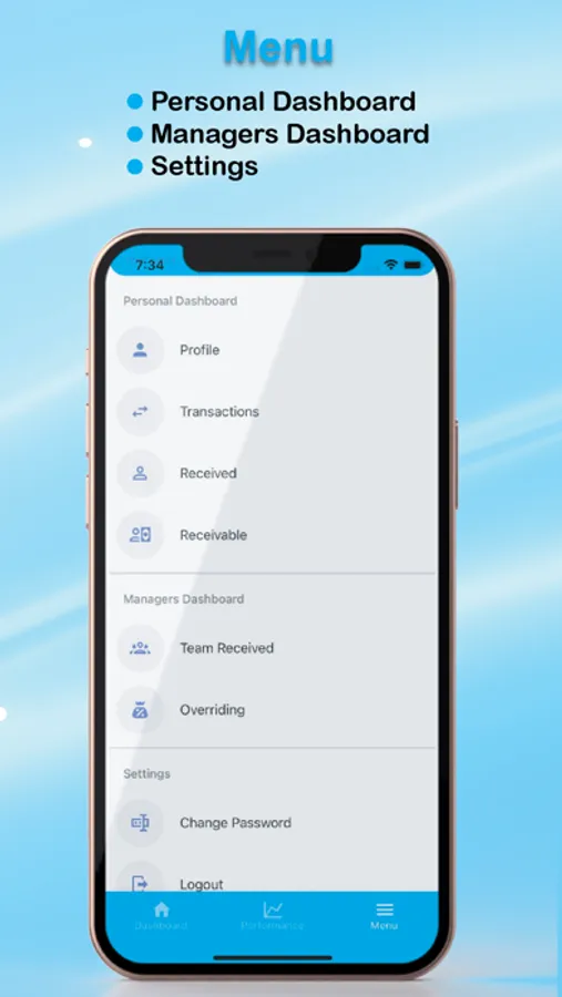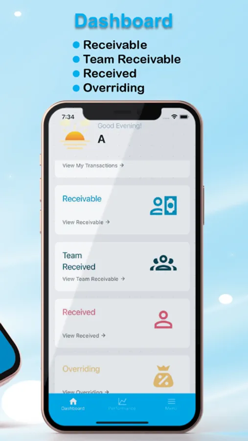 Virtual Office Mobile transparent platform to view Receivabe, Transaction, Team Received, Overriding, Receivable details of agent.