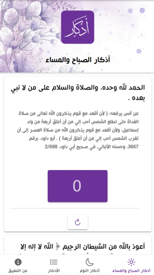 تطبيق أذكار مبسطة يحوي أذكار اليوم والليلة بشكل مبسط ويساعد على عد الأذكار.