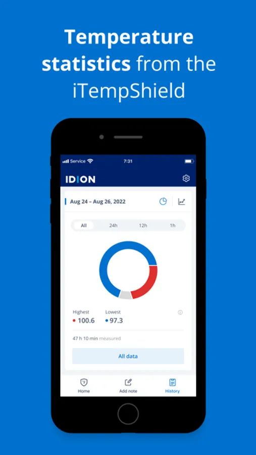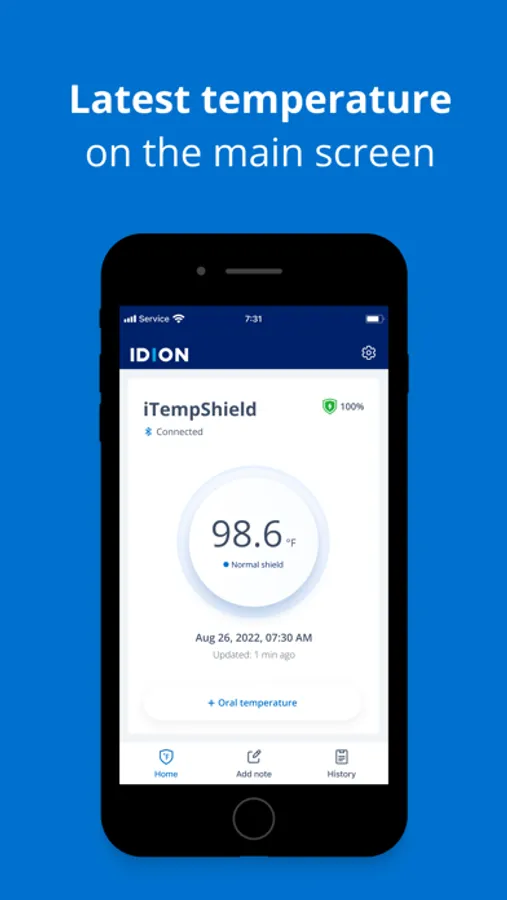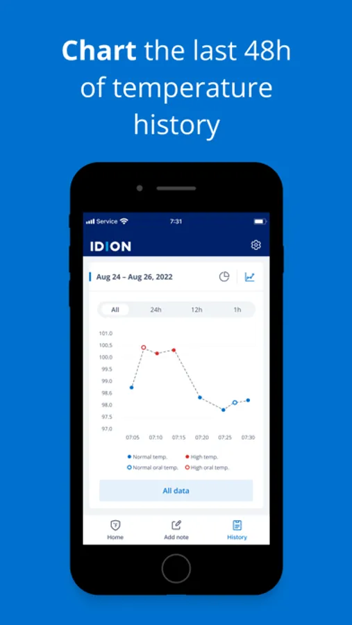 The IDION application together with the IDION Shield provides continuous remote monitoring of a patient’s body temperature. The IDION Shield reads a patient’s temperature every 5 minutes and sends the readings to the IDION application. In the IDION app, you can review your current temperature, 24h temperature history, and add oral temperature manually. Your IDION Shield can be worn for up to 30 days so that your clinicians can track your vitals constantly. Your temperature readings are available to your clinician at any moment.