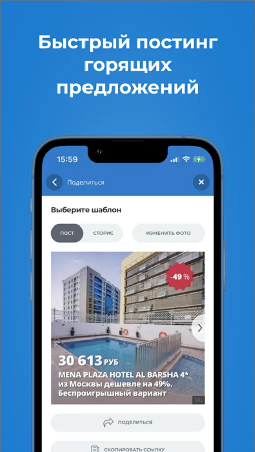 - быстрый репост - опубликовать пост в соцсети можно всего за пару кликов, для этого мы создали генератор картинок и текстов для каждого предложения