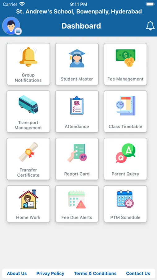 It will have Menu features like Alerts, Group Notifications, Online Fee payment, Online Classes, Time-table, Student Master Details, Transport Module with GPS Tracking, Attendance, Report Cards, Ticket Management, Home-work, Management Reports, Download Links etc.