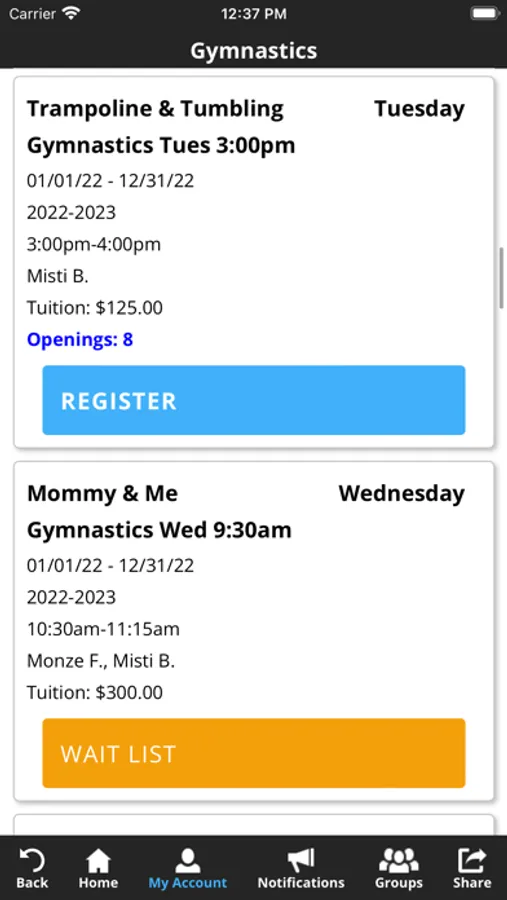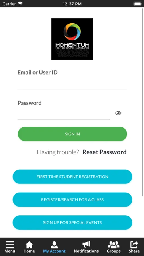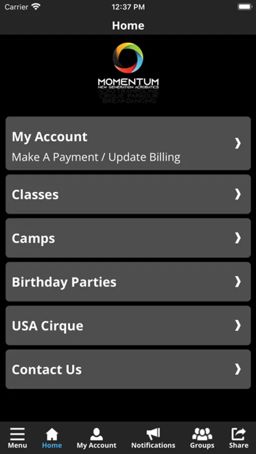 The Momentum Acrobatics app allows you to manage your account with ease, register for classes, parties, and special events. You'll also receive important notifications about class changes, closings, registration openings, special announcements, and upcoming events.