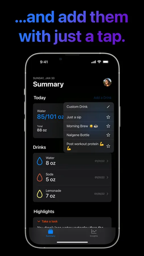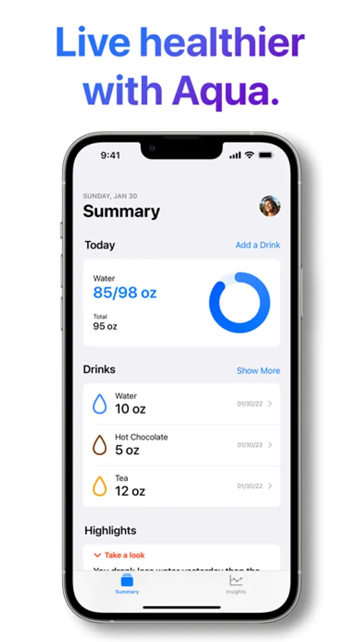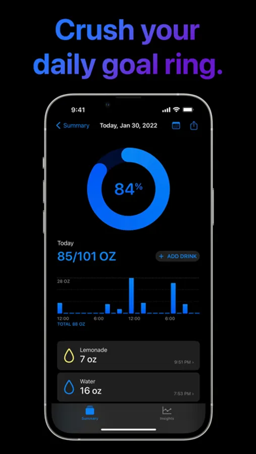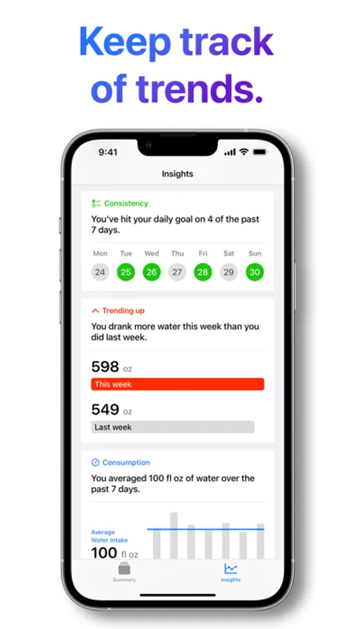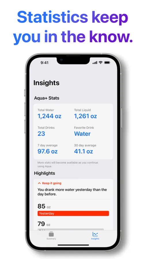 - Insights deliver powerful data that lets you adjust your water intake habits