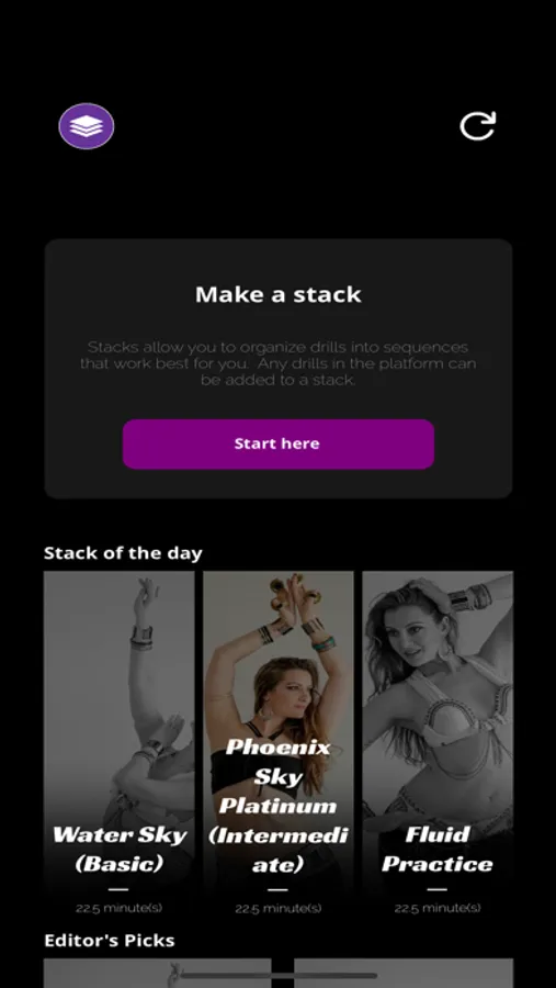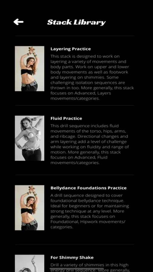 In addition to creating your own customized playlists, Belllydance Stackable Drills features lots of premade practice playlists of varying levels, technique focuses, and lengths of time. An especially exciting feature to keep you looking forward to your practice as well as progressing in it is our featured Daily Drill- a new one each day for each level!