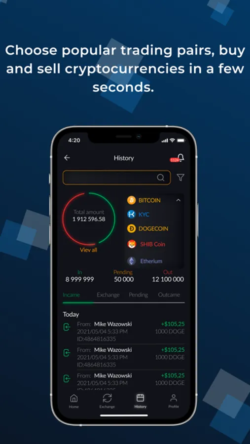 Slider with multichain. On the main screen, you can immediately view all the information about the total balance for each currency you own. Also, get direct access to statistics on changes in prices for all the cryptos you have in your wallet. The initial list of currencies includes popular coins - BTC, ETH, BNB, TRX, Shiba, USDT, Doge, KYC Token, XRP, and a few others. The KYC Coin team is constantly working on expanding the list of available cryptocurrencies. Popular and in-demand coins are added to it on a regular basis, including at the request of users.