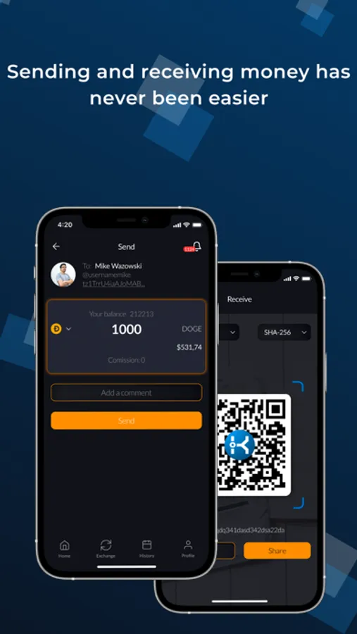 Receive - generate a QR code for your wallet address and provide your customers with a quick way to pay for your products or services. Just generate a QR code and place it in a visible place so that each customer can make payments without unnecessary clarifications and approvals.